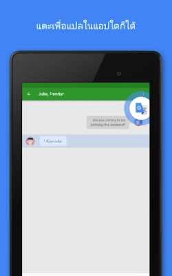 ค้นพบมิติใหม่ของการแปลที่หลากหลายและเข้าถึงได้ง่าย เพียงแตะเพื่อแปลข้อความที่คุณคัดลอกในแอปพลิเคชันใดๆ ก็ตาม ให้ Google แปลภาษาจัดการส่วนที่เหลือทันที สำหรับการเดินทางที่ไม่ต้องพึ่งพาอินเทอร์เน็ต โหมดออฟไลน์ของเราพร้อมให้บริการในกว่า 59 ภาษา เพื่อให้คุณสื่อสารได้ทุกที่ทุกเวลา ไม่พลาดทุกรายละเอียดด้วยการแปลทันใจผ่านกล้อง เพียงเล็งกล้องไปที่ป้ายประกาศ เมนู หรือเอกสารต่างๆ ข้อความก็จะถูกแปลปรากฏขึ้นบนหน้าจอของคุณในพริบตา และหากต้องการความแม่นยำยิ่งขึ้น คุณยังสามารถถ่ายภาพหรือนำเข้ารูปภาพเพื่อรับการแปลคุณภาพสูงได้อีกด้วย